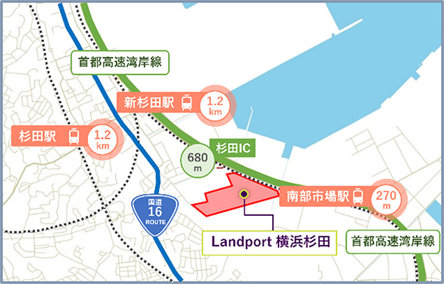 本施設は首都高速湾岸線「杉田」ICより約680m、横浜横須賀道路「港南台」ICから約3.4kmと、利便性の高い場所に位置しています。都心まで約30km圏内に位置し、湾岸~都心ルートのみならず、第三京浜道路や保土ヶ谷バイパス等を使っての輸送など、神奈川県内陸方面や都心方面の幅広い配送に適した立地条件を備えています。