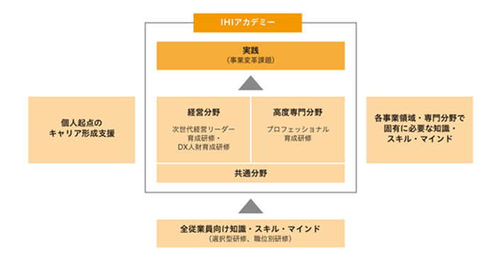 IHIアカデミーは、2023年4月にCEO直属の組織として活動を開始しました。「挑む、越える、解き放つ」をスローガンに掲げ、社内で変革をリードする人財の発掘・育成がミッションです。選抜された社員にはグループ会社の経営を担わせるなど高難度のプロジェクトに挑戦させてきました。また、意欲ある人財に門戸を広げるため、公募要素を取り入れた実践重視の研修プログラムも提供しています。これにより、従業員が自発的に挑戦し、自己成長を実感できる環境を整備し、2025年度には600名の変革人財の輩出を目指します。