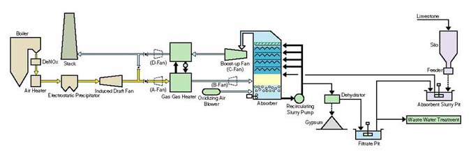 The construction of utility and industrial boilers has become quite complicated recently owning to the diversified use of fuel and because of the need to keep the air clean. As a consequence, flue gas desulfurization (FGD)systems for utility and industrial boilers now require the provision of control mechanisms meeting boiler requirements in addition to being designed against adversely affecting boiler combustion and against causing any secondary environmental pollution.