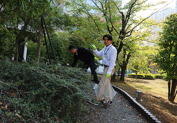 Around 100 employees took advantage of fine weather in participating in a litter cleanup in the streets around headquarters on October 27. The four bags of trash they collected comprises mostly empty glass and plastic bottles, cans, and cigarette butts.
