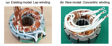 Figure 11 shows the winding method of the motor. For ETC-S, the lap winding method was adopted. The lap winding is superior in terms of performance and size, but automation is difficult, so the lap winding cannot be adopted for the ETC-M, which is intended for mass production. For this reason, the concentric winding has been adopted for ETC-M, in which coils of each phase are arranged radially. This has enabled automatic insertion with an inserter, making mass production possible. In addition, ETC-M has achieved a motor power of 20 kW with a 19% higher rotational speed and about 1.6 times higher torque than ETC-S.