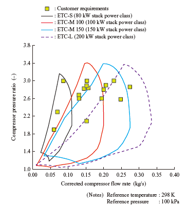 This ETC covers the low power stack region indicated as ETC-S in Fig. 2. With the expanded application of fuel cells to heavy-duty commercial vehicles, the power of fuel cell systems is getting high. Therefore, IHI is expanding its lineup of ETCs for the M, L, and LL power classes to meet customer demand. IHI has newly the ETC-M that covers the M power class The ETC-M has been improved in efficiency and manufacturability relative to the existing model ETC-S. The production volume of ETCs for fuel cell systems is expected to grow in the future, and therefore, we are required to shift from small production to mass production. This paper introduces the new model ETC-M, which is intended to be a highly efficient product that can be used in a wide range of applications, including not only passenger vehicles but also commercial vehicles, boats and ships, railways, and stationary fuel cells, and has a structure that allows mass production.