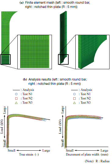 Figure 5 shows typical finite element models used in the analyses. Axisymmetric solid elements were used for modeling the round bar, notched hollow round bar and small punch test pieces. Three-dimensional solid elements were used for modeling Charpy type test pieces and plate test pieces such as notched thick plates, notched thin plates. The mesh size of 0.1 mm was used for the area surrounding an evaluated section in all finite element models. Figure 5 shows the typical relationship between loads and deformations obtained from the analyses of the coupon tests. The analysis results accurately reproduced the test results, demonstrating the validity of the analyses.