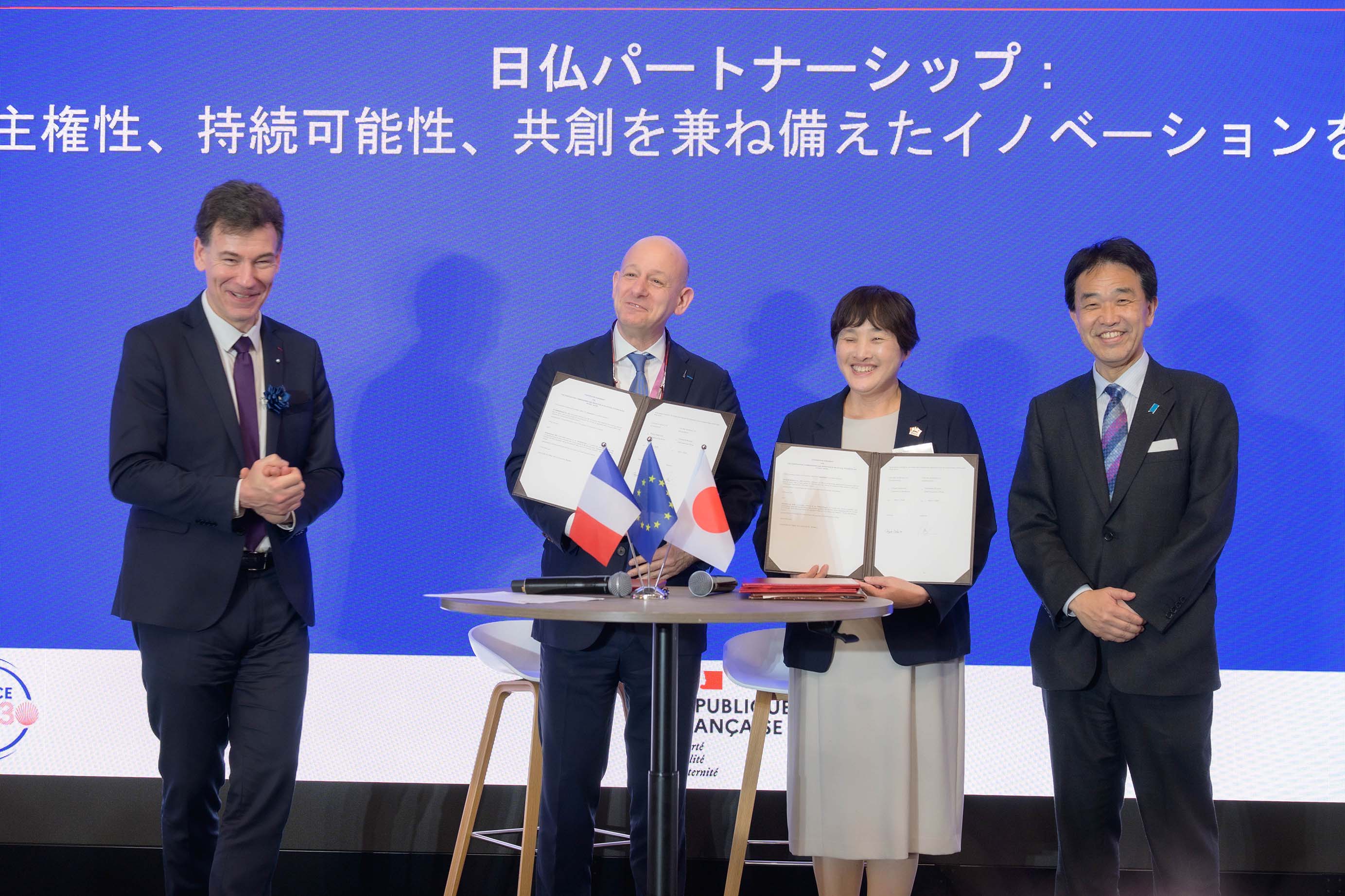 契約署名セレモニーの写真:左から、フランス 高等教育・研究・宇宙大臣フィリップ・バティスト氏、アリアングループ CEO クリストフ・ブリュノー氏、IA代表取締役会長 仲俣 千由紀、内閣府 宇宙開発戦略推進事務局長 風木 淳氏(写真提供:アリアングループ)