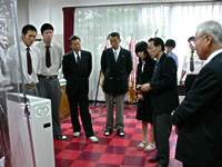 寄贈の初日となった7月6日、本社から一番近い学校の創造学園大学附属高等学校では、副校長、教頭や養護の先生はじめ、生徒を代表して生徒会正副会長に出席いただき、関係者や新聞社の記者の見守るなか、当社の大槻取締役、IHIシバウラテックの平林社長から装置の特徴や使用方法の説明を交えての寄贈の式典が行なわれました。