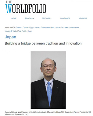 当社元代表取締役社長(現:株式会社IHI 社会基盤・海洋事業領域 副事業領域長),石原 進が2022年1月27日に英国通信会社「The Worldfolio」の取材を受け,そのインタビュー内容が米国の週刊誌「Newsweek 国際版 2022年4月号」及び「The Worldfolio」のホームページに掲載されました。