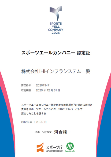 株式会社IHIインフラシステムは、スポーツ庁より「スポーツエールカンパニー2026」に、認定されました。今年で7年連続(シルバー認定)となります。