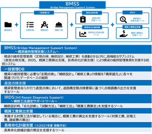「BMSS」は,橋梁の維持管理業務(定期点検、補修設計、補修工事)を連動させると共に,高機能なサブシステム(直営点検支援,IRDS,概算工費算出支援,長寿命化計画支援)により橋梁の維持管理業務を支援する統括システムです。