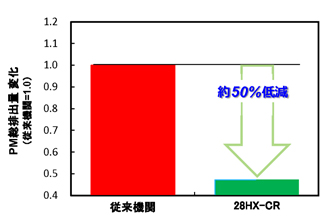 本エンジンでは,ポンプで高圧化した燃料をパイプ(コモンレール)に蓄え、電子制御によって燃焼室に噴射するコモンレールシステムを採用しています。従来エンジンと比較してPM総排出量を約50%低減できるほか,低負荷の状態では約6%燃費を向上でき,排気ガスに含まれるすすなどの量(排気煙濃度)を約38%削減可能です。