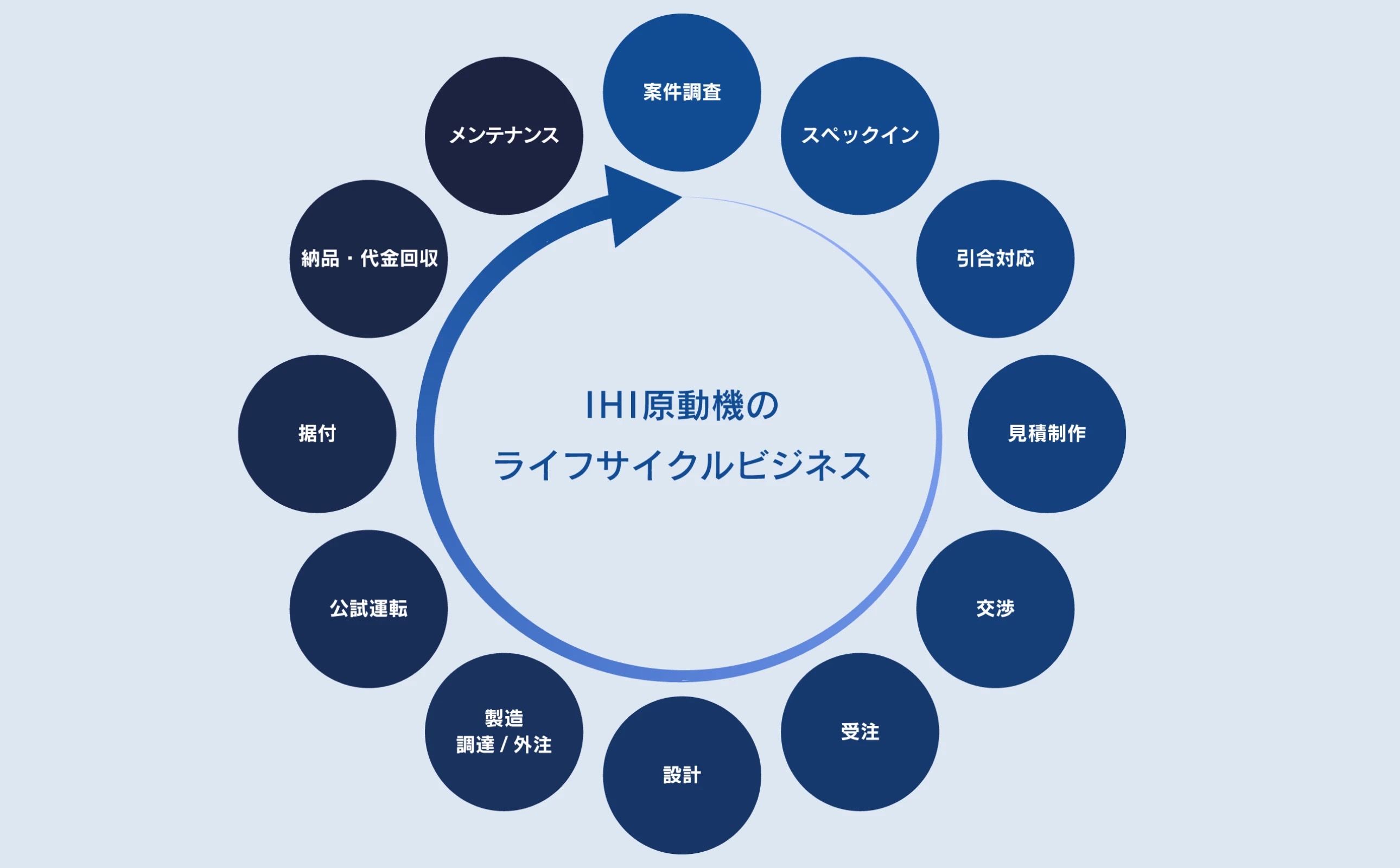 IHI原動機では、エンジンの研究・設計から製造、試験、納品、アフターサービスまで。すべてを自分たちの手で行うライフサイクルビジネスを採用しています。“考える”ところから“動かす”ところまで、妥協のないものづくりがここにあります。