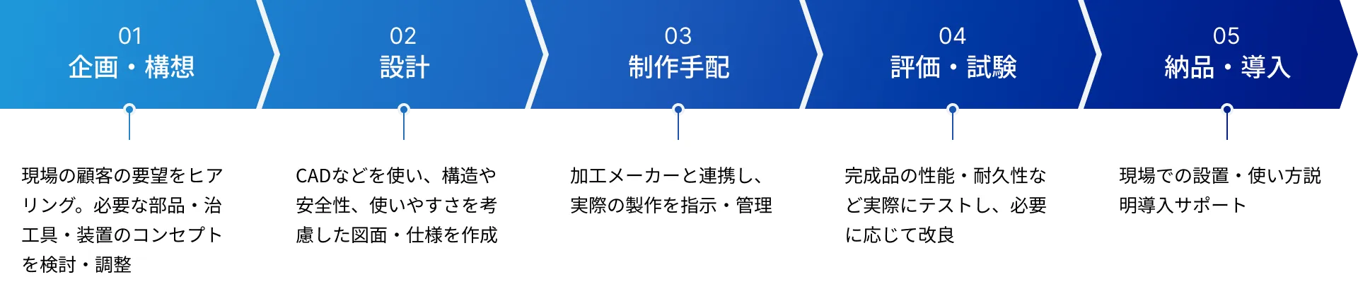 顧客の要望ヒアリング・構想検討から、CAD等を用いた設計、加工メーカーとの連携による製作手配、評価・試験、納品・導入までの一連の流れ。