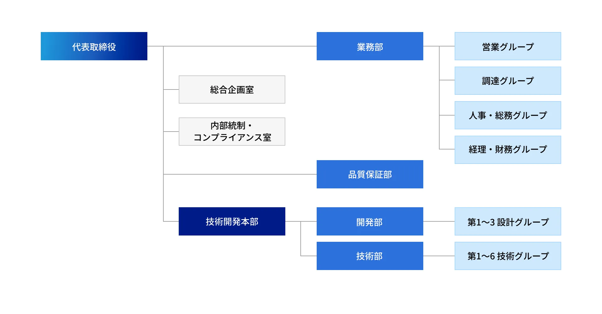 各事業を支える組織体制として、主に製品の開発や技術者派遣を行う「技術開発本部」、製品の品質を支える「品質保証部」、資材調達や営業等のバックオフィスを支える「業務部」など主に3つの部署と「総合企画室」で構成されています。