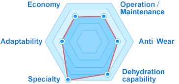 Our proprietary screw decanter centrifuge dedicated to synthetic resin dehydration. It features a specifically designed rotating bowl to significantly reduce water content compared to the conventional, general purpose types.