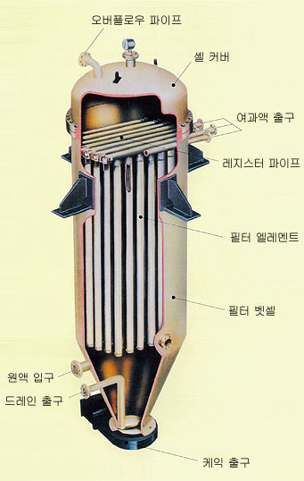 원액은 펌프를 이용해 필터 벳셀으로 투입 및 가압되어 여과가 이루어집니다. 여과액은 레지스터 파이프별로 필터 벳셀 상부의 여과액 출구로부터 회수됩니다. 필터 엘레멘트에 부착된 케익은 통기 건조 후, 백 블로우에 의해 고형 상태로 필터 벳셀 하부로부터 회수됩니다. 또한 역세정에 의해 슬러리 상태로 회수하는 것도 가능합니다. 여과운전 종료후에는 벳셀 하부의 자동밸브를 열어, 백 블로우에 의해 케익이 하부로 배출됩니다.