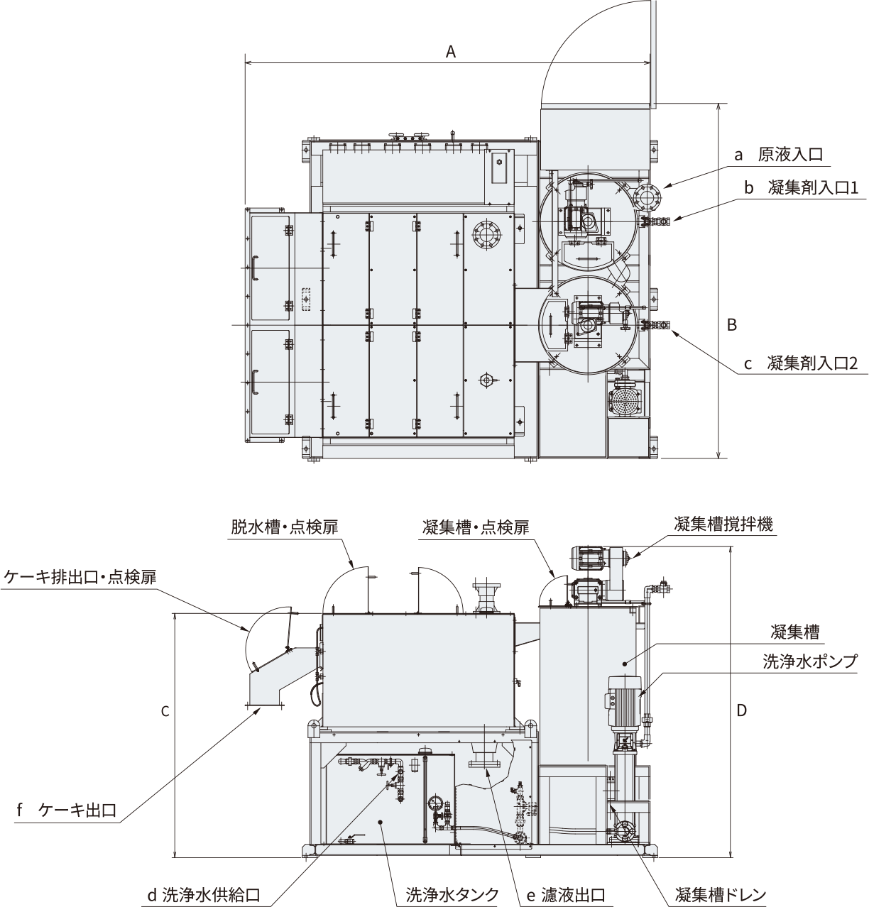 フロー図の破線内側にある機器がパッケージ化されています。原液と薬品を凝集槽へ供給し、脱水ケーキはケーキシュートより、濾液は濾液出口よりそれぞれ排出されます。