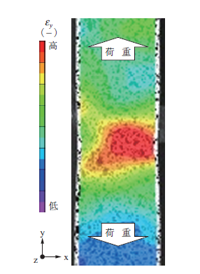 DICで得たひずみ分布を用いて真応力と真ひずみを取得した.第2図に示したようにひずみに局所性があるため,本研究ではネッキング部の断面における平均ひずみと平均応力を求めることで真応力-真ひずみ関係を決定した ( 2 ).まず,DICによって得られた最終破断位置における軸方向ひずみεyを幅方向に平均化したひずみ を求め,これを真ひずみεTとした.
