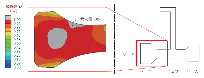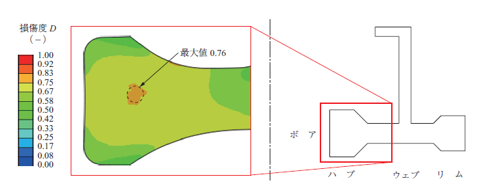 続いて,本ディスクのバースト形態について検討した.バースト解析より,本ディスクにおいて慣性力の増加によってディスク内部で力の釣り合いを満たせなくなり,構造体として成立せずに加速度的な変形増大が生じる構造不安定点が存在することが判明した.この構造不安定点におけるディスク内での破断の有無を検証するために,構造不安定点でのディスクの損傷度分布を確認した結果を第10図に示す.損傷度Dが最大となる位置はハブの内部であり,試験で亀裂が観測されたウェブ内径側に近い位置であった.このときの損傷度の最大値はD = 0.76であり,1.0を下回っていることから構造不安定点で延性破壊が発生していないことが分かった.このことから,本ディスクのバースト形態は構造不安定バーストであることが明らかとなった.