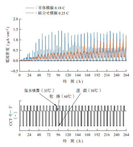 次にACMセンサを用いた評価の結果を考察した.第7図 - ( b ) の組合せ模擬で電流が流れ続けるのは,- ( a ) の単体模擬では乾燥フェーズごとに乾ききるが,- ( b ) の組合せ模擬では乾燥フェーズでも濡れが維持されていることを示す.Tomashovモデル ( 6 ) によると,金属表面の水膜が1 μm前後のとき,つまり乾ききる直前に腐食速度が最も高くなることが知られている.予備試験で,材料A単体の場合の方がアクリルと組み合わせた場合よりR.N.が低くなったのは,乾燥のフェーズで毎回乾ききり,最も腐食速度が高くなる状態をサイクルごとに経ることで腐食が進むためと考えられる.