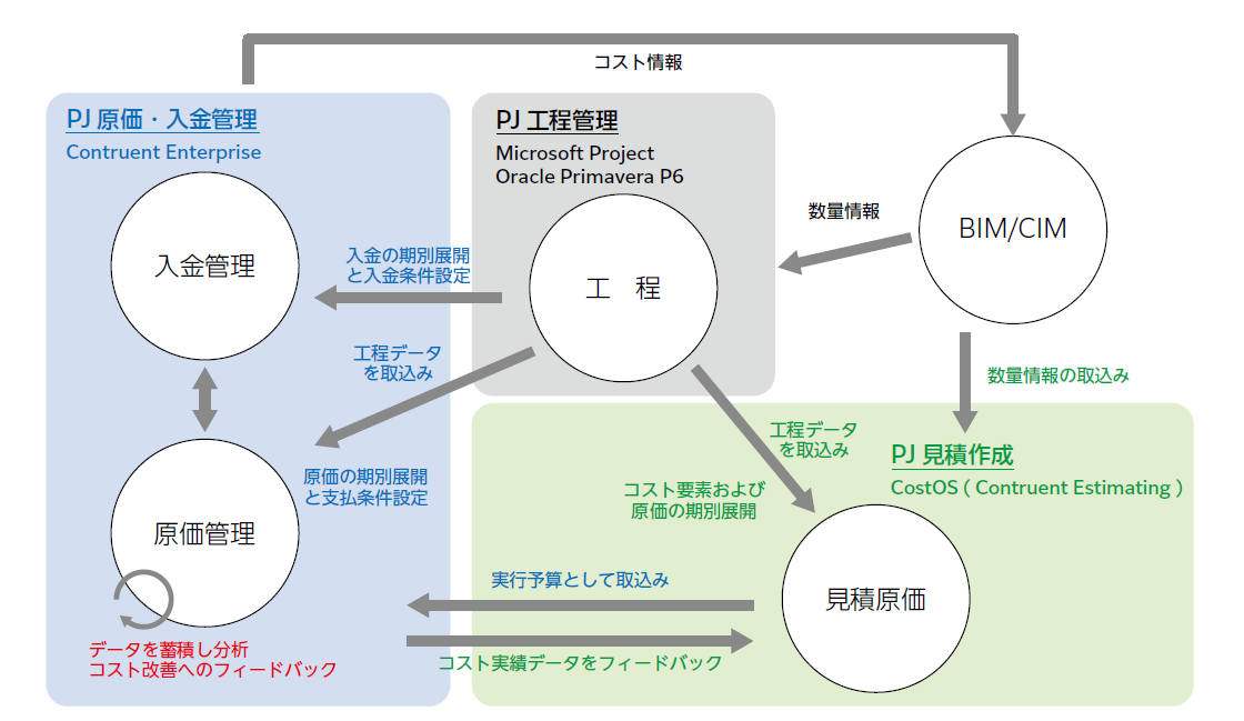- PJ管理では世界中でさまざまなシステムが使用されている.数年にわたる調査・検討の結果,見積・工程・原価管理間のデータ連携とIHIグループの行う原価管理手法の実現という観点から,米国のContruent社(旧ARES社)のContruent Enterprise(旧PRISM)というシステムを選定し,導入を進めている.同システムでは,まず見積ソフト(英国のNomitech社製のCostOS)にて積み上げ積算を行い,データ連携にて原価管理ソフトへコスト情報としてデータ移行する.原価管理は,IHIグループで使用している会計システムから原価の実績データを毎月取り込みながら行われる.また,EVM ( Earned Value Management )機能も実装しており,数量進捗およびコスト実績に基づく的確な将来予測により,確実性を高めた原価管理が可能である.WBS単位で蓄積されたデータは見積ソフトにデータベースとしてフィードバックされ,実効性のある見積データとして新規PJの入札に有効活用される.