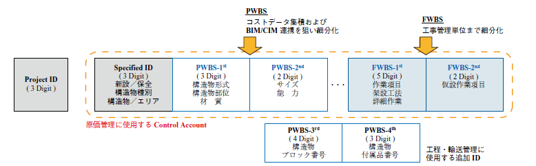 - 本WBS体系では,PJによらず同じモノに対する同じコト(例えば,橋梁鋼桁工事での添接板の高力ボルト締付作業)には同一のWBS IDが割り当てられる.これによりPJ横断で該当原価のApple to Appleの比較(同一目線での比較)が可能となる.PJの作業ごとの原価悪化が早期に発見できるほか,とあるPJの原価改善対策が数値として顕在化され,他のPJの原価改善のヒントとして展開することが可能となる.