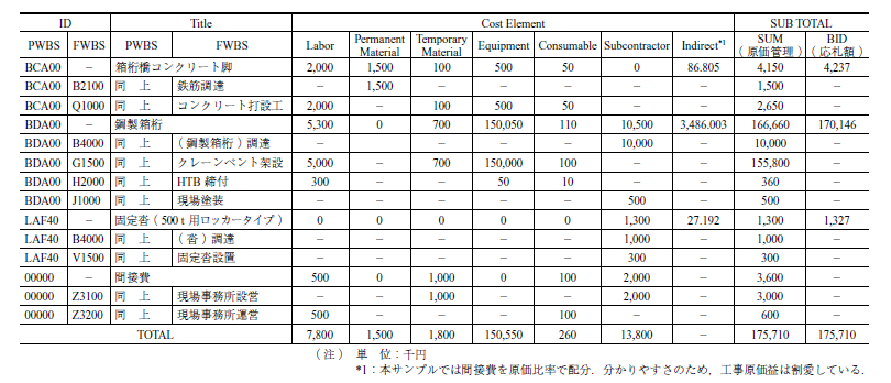 工事の各作業( PWBS + FWBS )で使用されるLabor,Permanent Material,Temporary Material,Equipment,Consumableなどのコスト要素( Cost Element )が各WBSの構成要素として二次元マトリクスに展開され,見積もり(原価)を構築する.各Cost Elementはさらに,工程変動によりコスト変動が伴うものと,そうでないものを仕分ける目的で細分化している.例えばEquipmentであればProcured EquipmentやRental Equipmentおよび使用後の処分に使用するSalvageなどに分けられている.