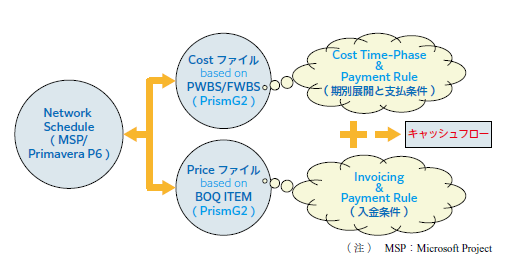 - 原価管理ソフトに渡されたコストデータはCostファイルとしてMicrosoft Project(米国Microsoft社製)やPrimavera P6(米国Oracle社製)などのネットワーク工程管理システムとデータ連携される.各作業の順序や依存関係を工程管理システムの中で可視化しながら,該当コストが期別に適切に展開される.今回の取り組みでは,入金についても別のPriceファイルを作成し,元請け契約に従った入金条件の登録や契約変更も同システムで管理することにした.これにより,Priceファイルで元請け契約条件が,Costファイルで下請け契約条件がそれぞれ異なるものとして適切に設定される.それぞれのファイルを工程管理システムとデータ連携し,適切に期別展開された入金・出金のデータをつなぎ合わせることで,正しいCF管理が可能となる.