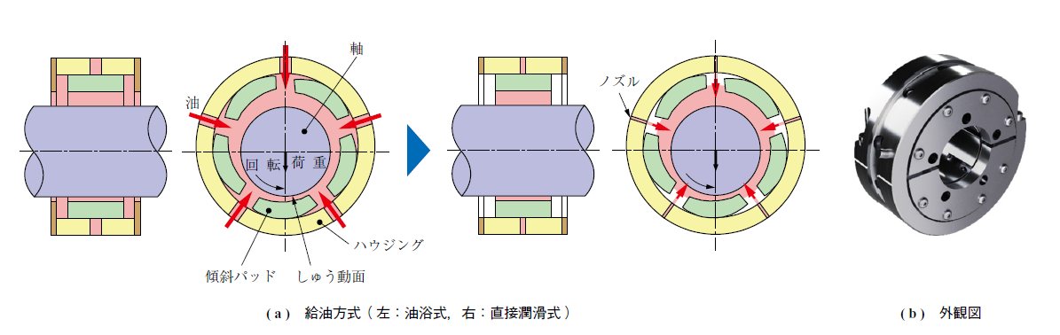 ターボコンプレッサーのインペラを支持するピニオン軸受は,軸が高速回転するため,機械損失低減と振動安定性の両立が求められる.TRZ 型では,従来の油浴式から直接潤滑式に変更したティルティングパッド型すべり軸受を採用した.油浴式は軸受内部を潤滑油で満たし,ピニオン軸の回転でしゅう動面に給油する方式であるが,潤滑油の攪拌損失や軸受温度上昇が課題だった.直接潤滑式は,給油ノズルでしゅう動面に潤滑油を直接噴射し,軸受内部での潤滑油循環による攪拌損失と温度上昇を抑えることができる.TRZ 型はさらにその設計を進化させ,耐荷重性能と冷却性能向上により,機械損失の低減と機器のダウンサイジングを両立した.